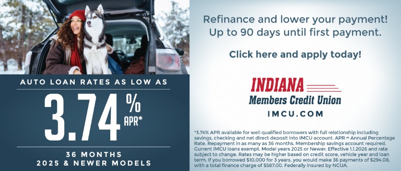 1 3.74% APR available for well qualified borrowers with full relationship including savings, checking and net direct deposit into IMCU account. APR = Annual Percentage Rate. Repayment in as many as 36 months. Membership savings account required. Current IMCU loans exempt. Model years 2025 or Newer. Effective 01.01.2026 and rate subject to change. Rates may be higher based on credit score, vehicle year and loan term. If you borrowed $10,000 for 3 years, you would make 36 payments of $294.08, with a total finance charge of $587.00.