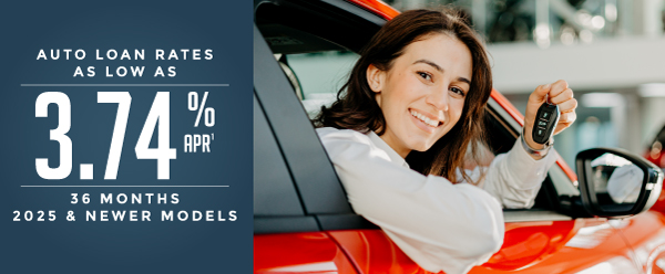 1 3.74% APR available for well qualified borrowers with full relationship including savings, checking and net direct deposit into IMCU account. APR = Annual Percentage Rate. Repayment in as many as 36 months. Membership savings account required. Current IMCU loans exempt. Model years 2025 or Newer. Effective 02.01.2026 and rate subject to change. Rates may be higher based on credit score, vehicle year and loan term. If you borrowed $10,000 for 3 years, you would make 36 payments of $294.08, with a total finance charge of $587.00.